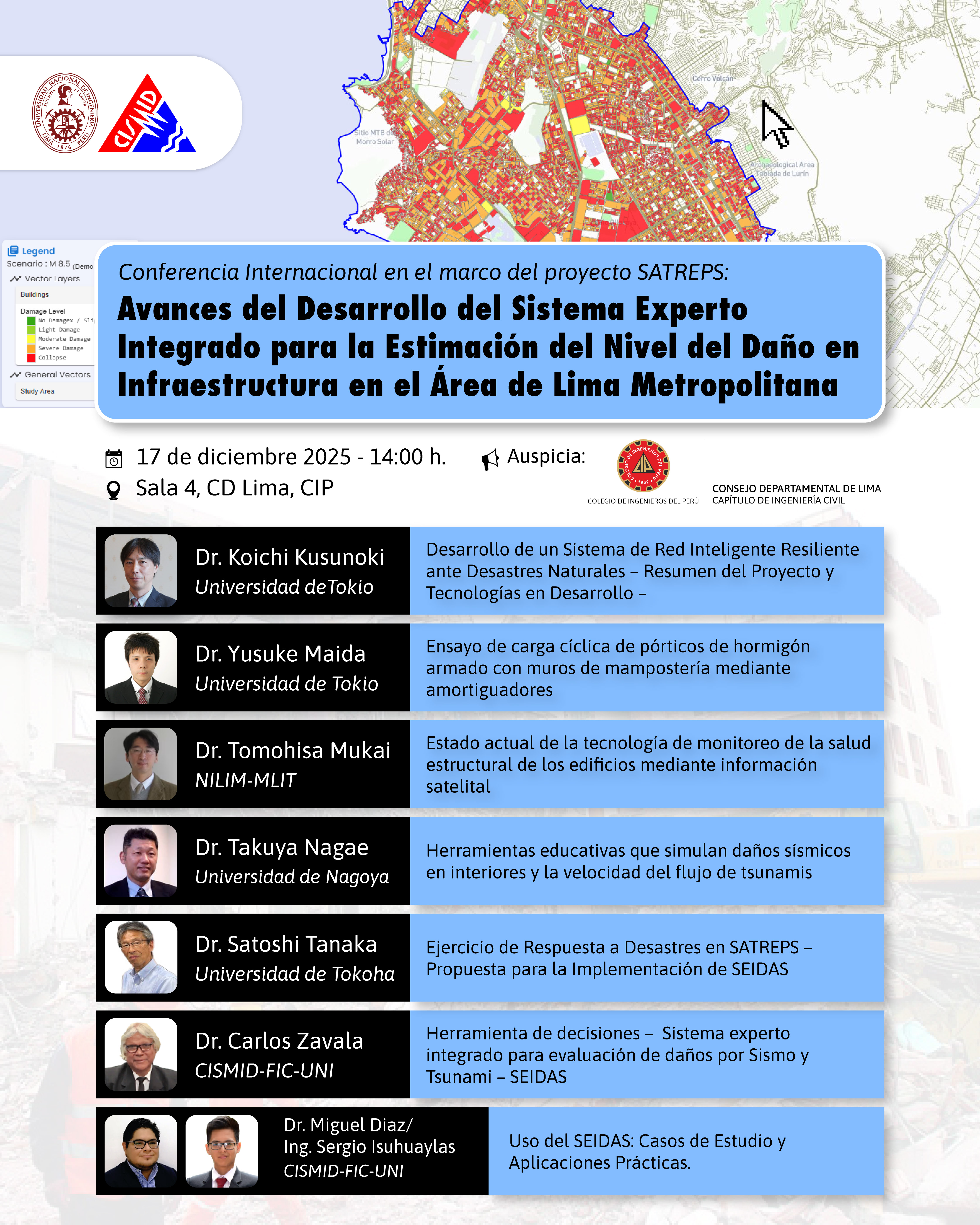 En esta conferencia internacional, investigadores japoneses y especialistas de CISMID – FIC – UNI presentarán investigaciones recientes vinculadas a la gestión del riesgo de desastres, así como los últimos avances en el desarrollo e implementación de SEIDAS en el Perú, generando un espacio de intercambio entre academia, instituciones públicas y tomadores de decisión.